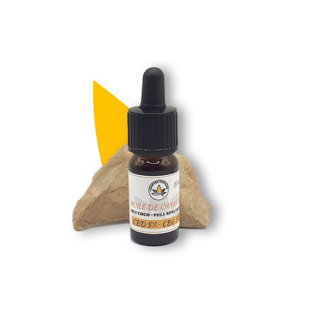 Huile CBD – CBG en flacon de 10 ml avec pipette. Ingrédient : MCT coco Bio, extraction CO2 supercritique, 100% Français. CBD 5,08 % – CBG 5,03 % – THC 0,30 %