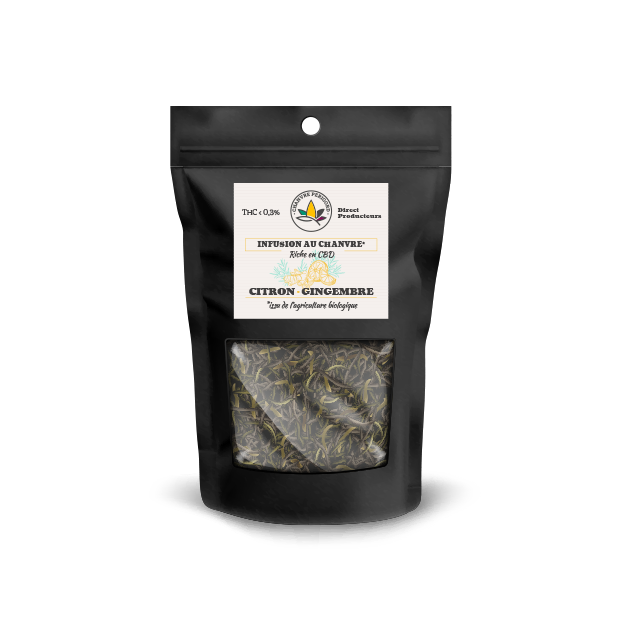 Tisane en sachets de 30gr. Mélanges gourmands Citron Gingembre, agrémentés de notre chanvre décarboxylé par nos soins.