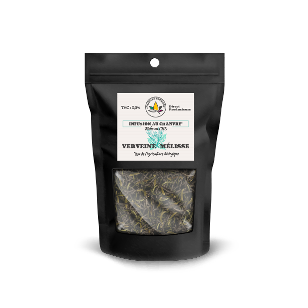Mélanges gourmands Verveine – Mélisse agrémentés de notre chanvre décarboxylé par nos soins.